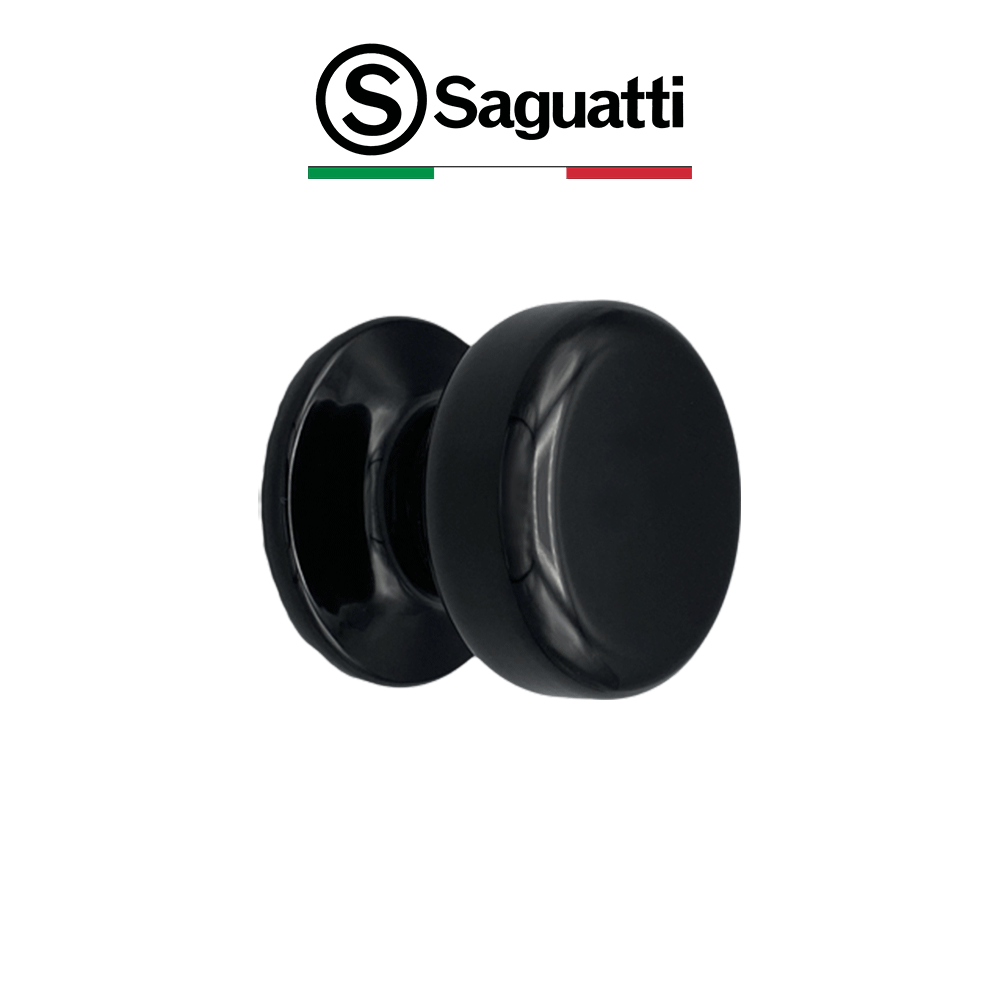 L'azienda Italiana Saguatti è riuscita a brevettare questi nuovi pomoli che pongono fine ai problemi estetici e di collocamento sulle porte. Con lʼeliminazione della vite passante col copridado e delle viti esterne, non solo ci offre un grande miglioramento estetico, ma ci permette anche di sistemare il pomolo in qualsiasi spazio e in maniera più convincente e saldata rispetto alle precedenti operazioni con vite passante. In questo caso abbiamo un pomolo fisso per porta in alluminio verniciato con testa piatta ed attacco brevettato, con base in nylon e vite in acciaio. Dimensione Ø70, finitura in nero 9005.